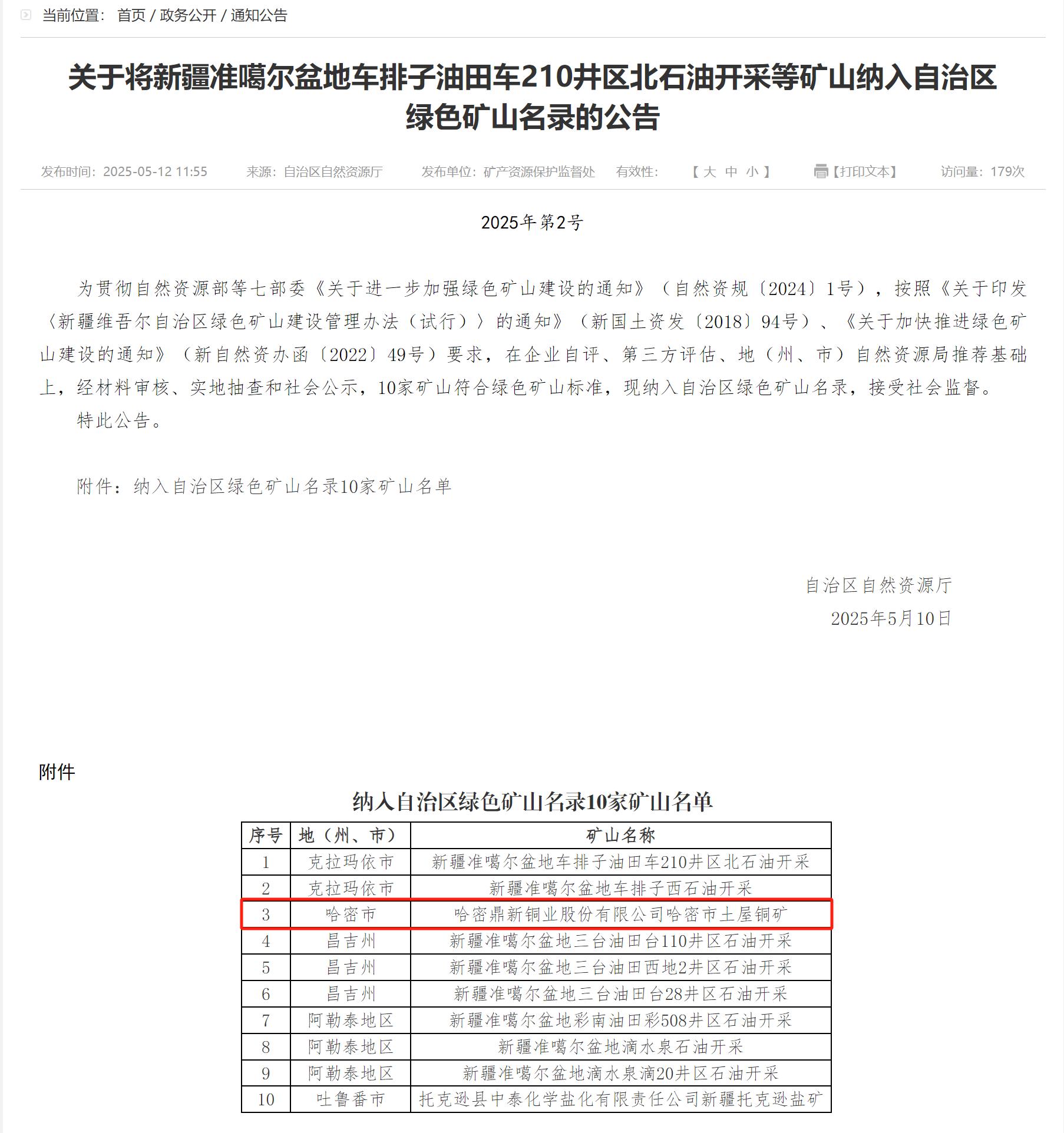2025 年5 月12 日,自治区自然资源厅网站发布公告,哈密suncitygroup太阳新城股份有限公司土屋铜矿等10 家矿山符合绿色矿山标准,被纳入新疆自治区绿色矿山名录。此次入选,标志着土屋铜矿在绿色矿山建设方面得到官方认可,此成功经验为其新建延东铜矿项目绿色矿山建设积累宝贵经验。