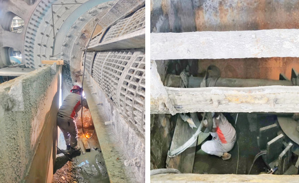 选厂员工焊接球磨机圆筒筛筋板 选厂员工焊补浮选机槽体