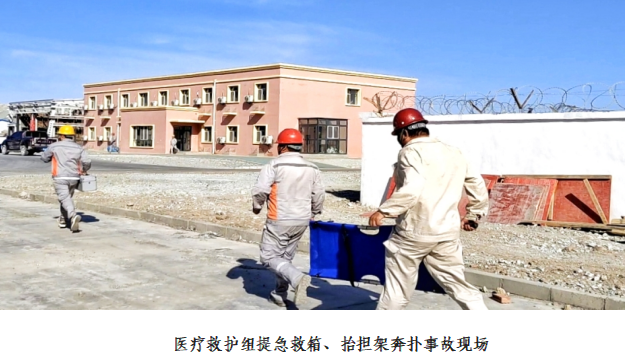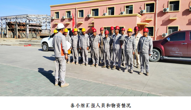 9点20分应急救援组、医疗救护组、警戒疏散组、后勤保障组四个小组在选厂办公楼前集合,向总指挥李文汇报人员和物资准备情况,随后总指挥做安全生产及演练动员讲话,并宣布应急演练开始。
