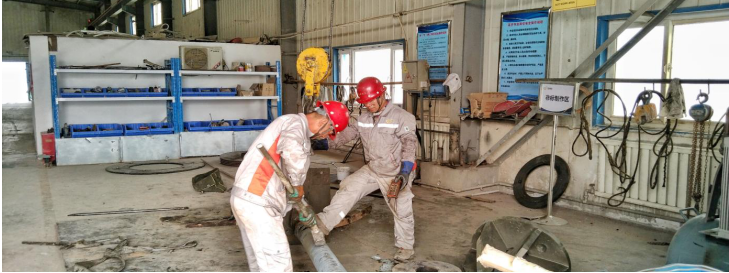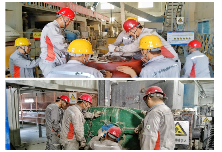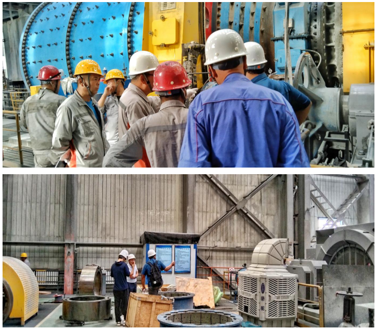检修现场选矿厂作业人员奔赴一线,技术人员负责现场指导,厂长、副厂长、各车间主任、安全员跟随检修项目到现场进行安全巡检,确保检修工作能够安全且保质保量的完成。在磨机平台,选矿厂特邀中信重工技术人员就一期磨机中空轴轴瓦和二期磨机主电机维修方案进行现场指导。