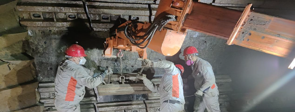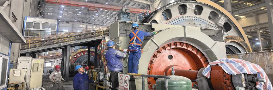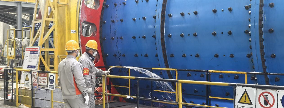 球磨机衬板更换现场,在项目负责人和专业技术人员指导下,现场操作人员昼夜奋战,严格按照方案更换一、二系列球磨机衬板,确保更换迅速、准确、稳定,保障选矿厂持续生产。